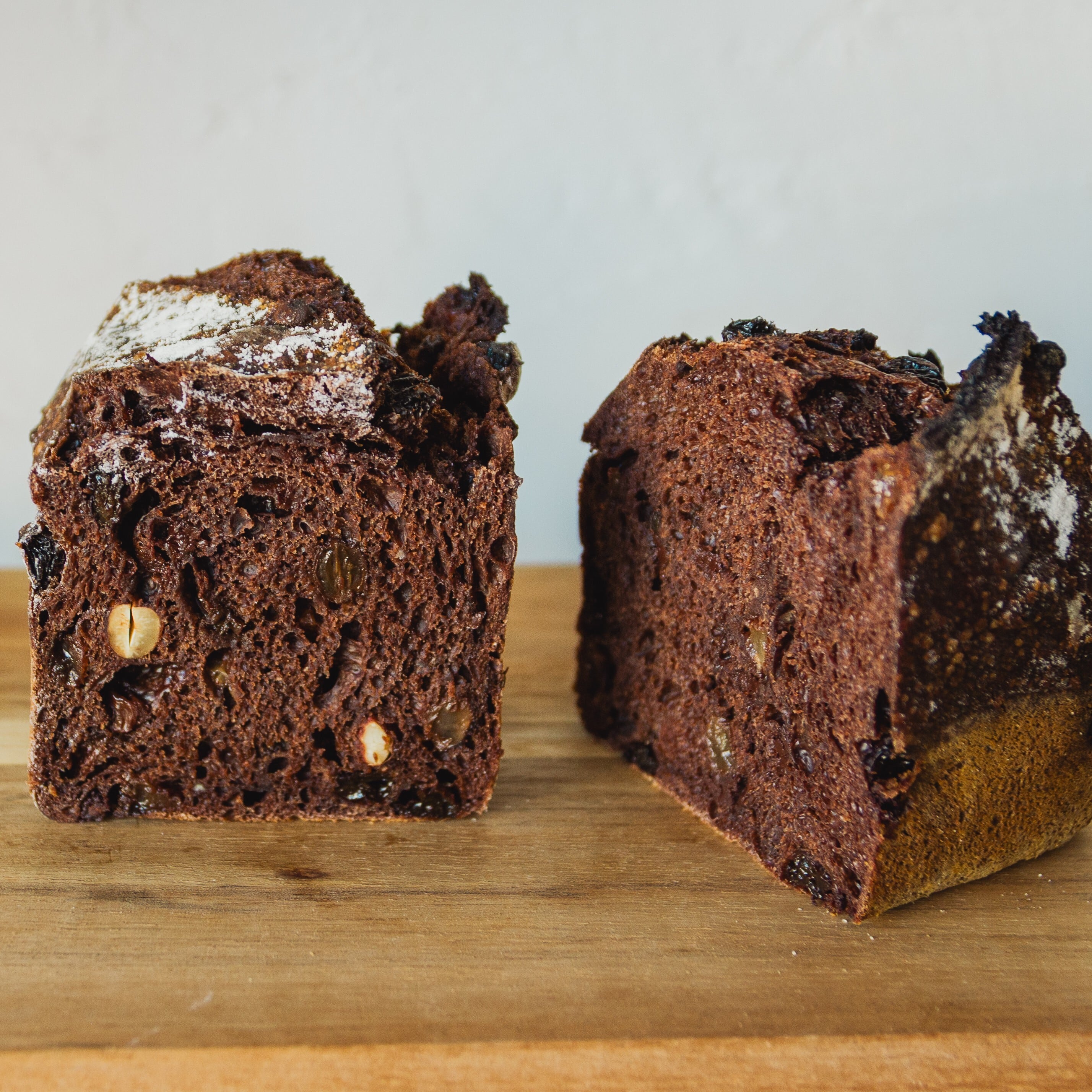 ボヌール生地に有機ココアパウダー、国産ラム酒に漬け込んだ有機チョコチップ、ドライフルーツ、ナッツ、を練り込む。パウンドケーキ型でお焼きしてしっとり仕上げました。