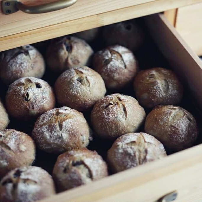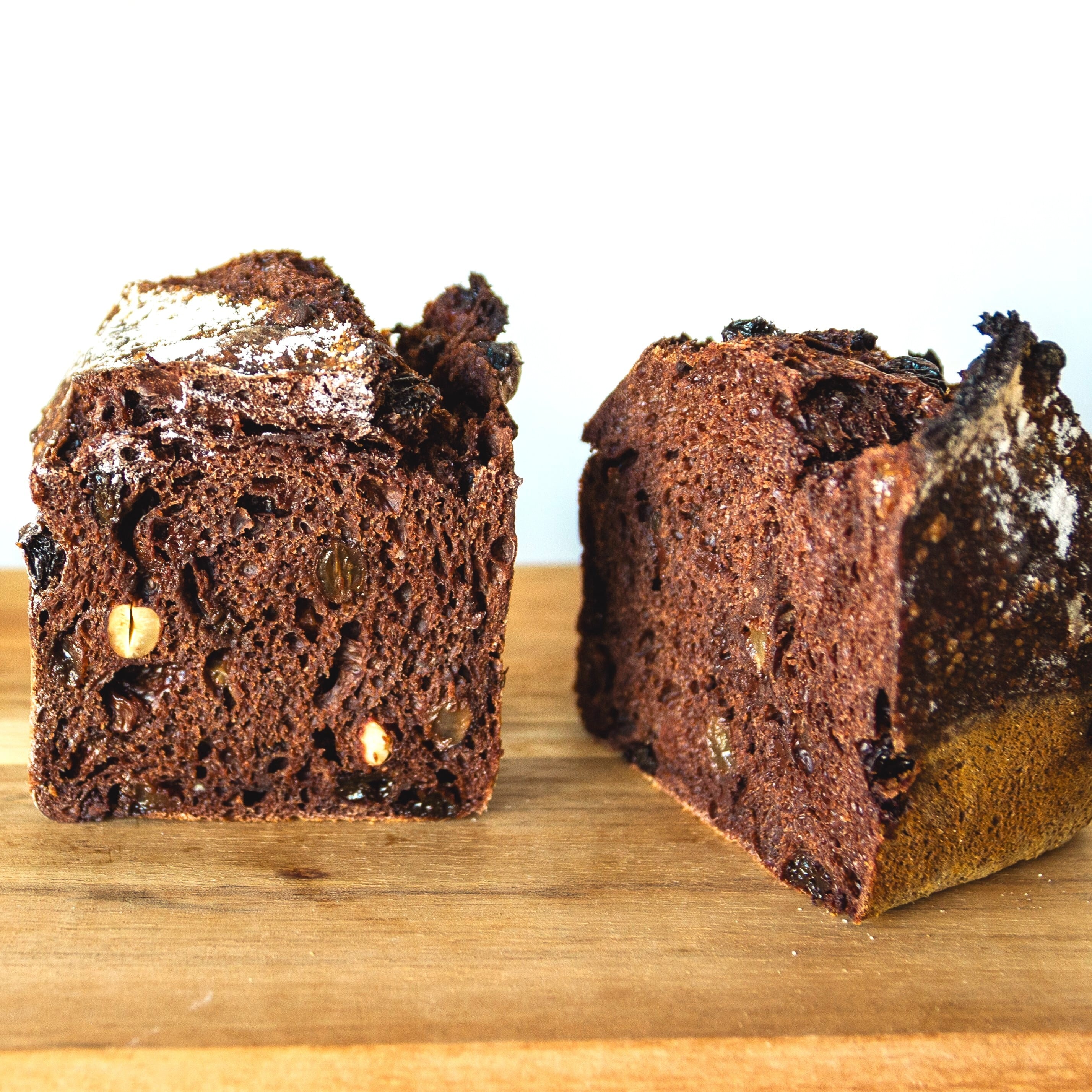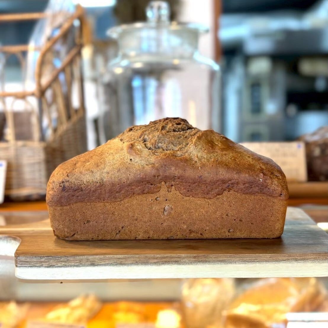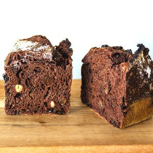 国産ラム酒に漬けた有機ドライフルーツ、有機ナッツ、有機チョコチップを有機ココアの生地に練り込みました。しっとりした生地のパン。(アルコールは飛んでます)店主が大好きなパンです。