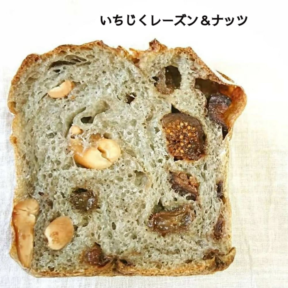有機赤ワインに漬けた有機白イチジクと有機トンプソンレーズン、有機カシューナッツを生地に練り込み焼きました。
